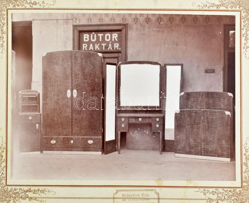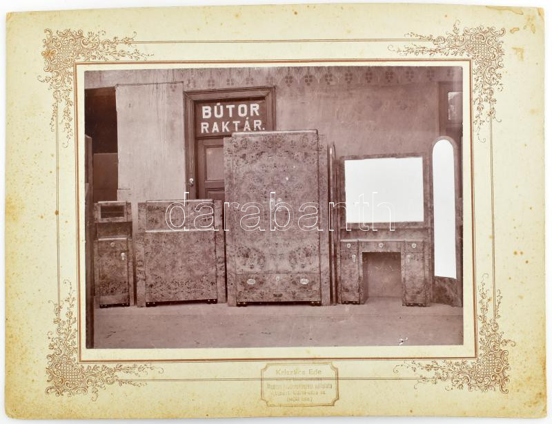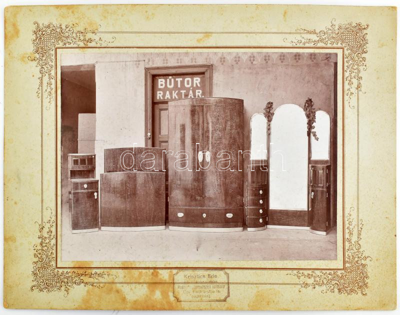cca 1910 Krisztics Ede mű- és bútor-asztalos Modern lakberendezési vállalata (Újpest, Mária-u. 14.) raktárában kiállított bútorok, 4 db nagyméretű fotó, pecséttel jelzett, dekoratív kartonon, foltokkal, 23x17 cm (karton: 33x25 cm)