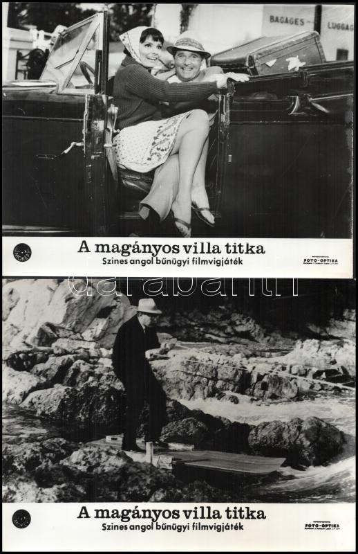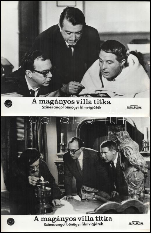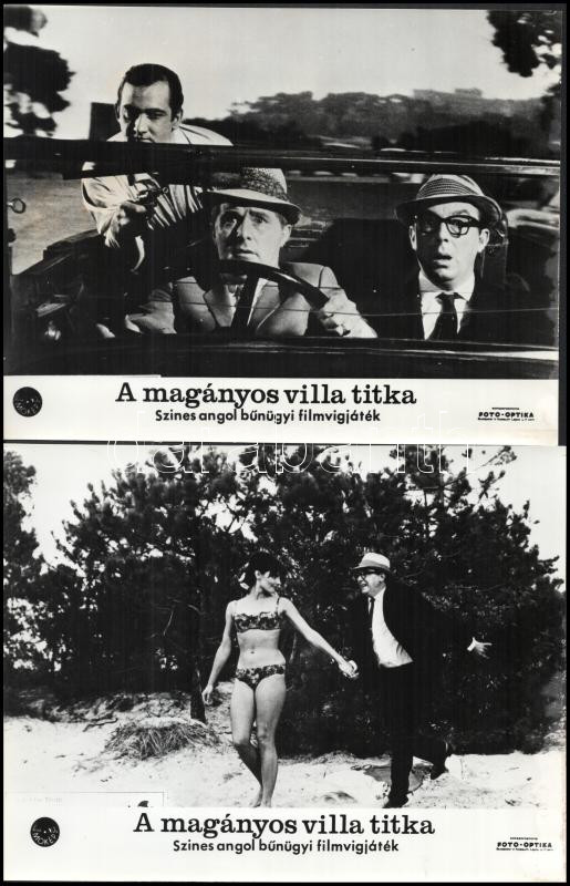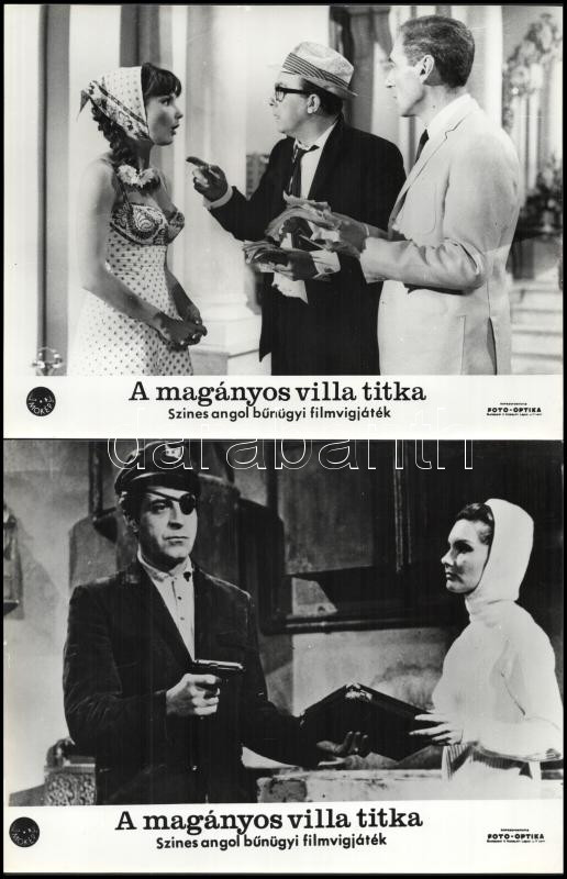 cca 1966 ,,A magányos villa titka" című angol bűnügyi filmvígjáték jelenetei és szereplői, 8 db vintage produkciós filmfotó (vitrinfotó, lobbyfotó) ezüst zselatinos fotópapíron, a használatból eredő (esetleges) kisebb hibákkal, 18x24 cm