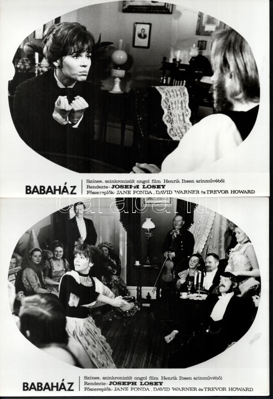 cca 1973 ,,Babaház" cÃmű angol film jelenetei és szereplÅ‘i (köztük Jane Fonda), 7 db vintage produkciós filmfotó (vitrinfotó, lobbyfotó) ezüst zselatinos fotópapÃron, a használatból eredÅ‘ (esetleges) kisebb hibákkal, 18x24 cm