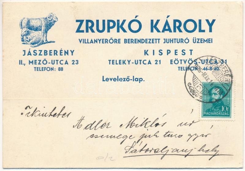 1936 Zrupkó Károly villanyerőre berendezett juhtúró üzemei reklám. Jás... https://www.darabanth.com/hu/455-Gyorsarveres/455.0/Kepeslapok/Reklam~1500043/1936-Zrupko-Karoly-villanyerore-berendezett-juhturo-uzemei-reklam-Jaszbereny-Mezo-utca-23~II3037904