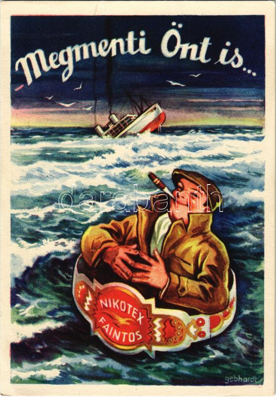 Leírás: Megmenti Önt is... Nikotex Faintos nikotinmentes cigaretta reklámlapja / Hungarian nicotine-free cigarette advertising card s: Gebhardt (EK)