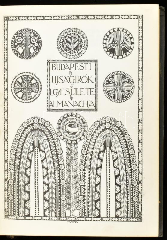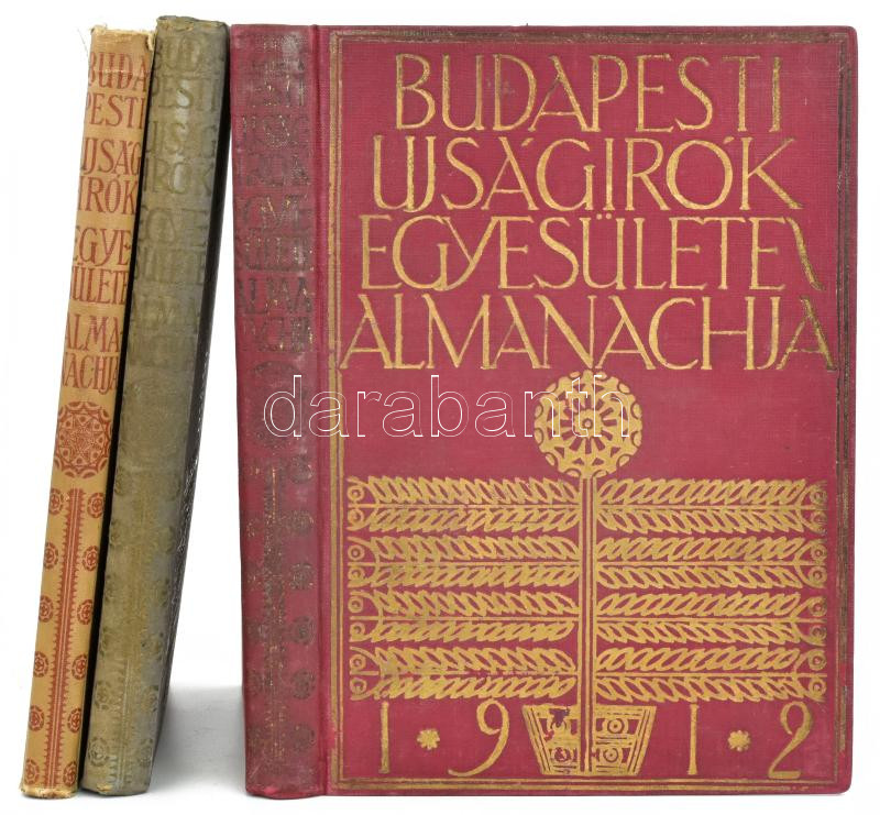 1912-1914 Budapesti Újságírók Egyesülete és Almanachja 1912., 1913., 1914. Bp., 1912-1914, Nyugat-ny., 2+7-368+1 p.; 440 p.; 196 p.; Szövegközti fekete-fehér képanyaggal. Korabeli reklámokkal. A címlapon és az előzéklapon Kozma Lajos szecessziós rajzával. Benne az Budapesti Ujságírók Egyesületének tisztikarával és választmányával. Kiadói szecessziós, festett egészvászon-kötések, kopott, kissé foltos borítókkal, az 1914-es kötet gerincén kis sérüléssel.