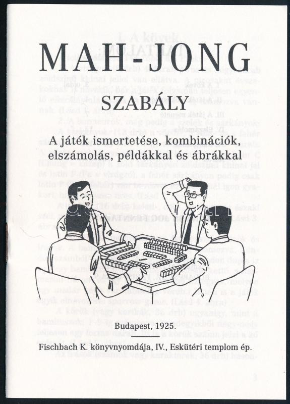Hergár Emil: Mah-jong szabály. Terebess, Budapest, 1997. Az 1925-ös Fi... https://www.darabanth.com/hu/455-Gyorsarveres/455.0/Konyvek/Konyvek-Egyeb-ritkasagok~2000032/Hergar-Emil-Mah-jong-szabaly-Terebess-Budapest-1997-Az-1925-os-Fischbach-K-kiadas-reprint~II3038463