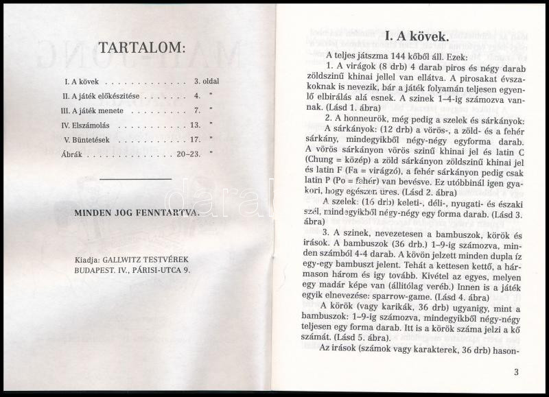 Leírás: Hergár Emil: Mah-jong szabály. Terebess, Budapest, 1997. Az 1925-ös Fischbach K. kiadás reprint kiadása. Kiadói papírkötés, újszerű állapotban