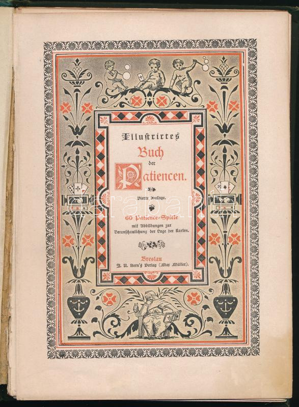 Illustrirtes Buch der Patiencen. 60 Patience-Spiele mit Abbildungen zur Veranschaulichung der Lage der Karten. Breslau, é.n., Kern's Verlag, 2 sztl. lev.+ 112 p. Negyedik kiadás. Német nyelven. Kiadói illusztrált, festett egészvászon-kötés, a borítón némi kopással, az első két lap kijár.