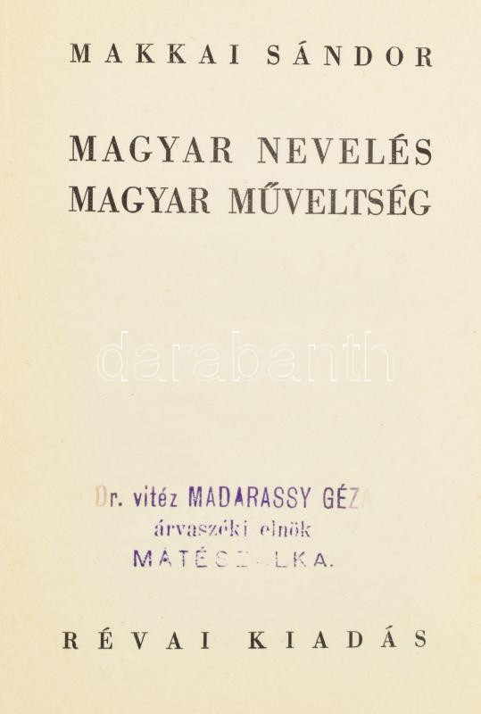 Leírás: Makkai Sándor: Magyar nevelés, magyar műveltség. Bp., 1937, Révai, 252 p. Kiadói egészvászon-kötés, tulajdonosi névbélyegzővel (Dr. vitéz Madarassy Géza árvaszéki elnök, Mátészalka).