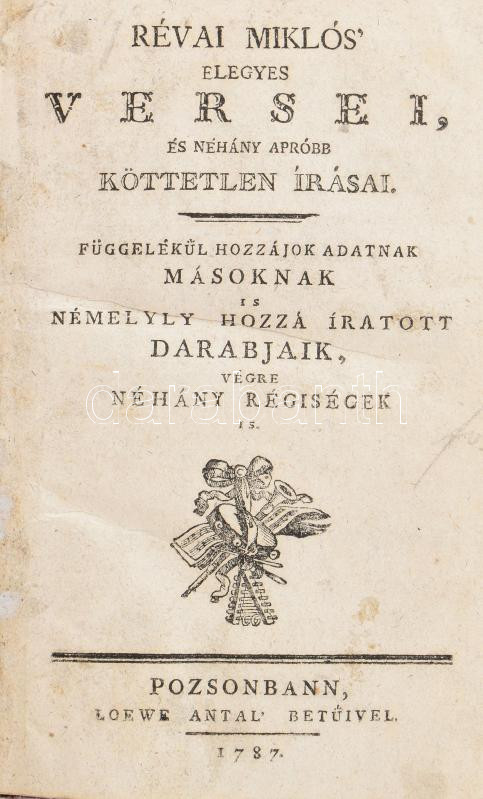 Révai Miklós elegyes versei, és néhány apróbb köttetlen írásai. Függelékül hozzájok adatnak másoknak is némelyly hozzá íratott darabjaik, végre néhány régiségek is. Pozsony, 1787., Loewe Antal. Korhű javított kartonált papírkötésben 325p. Utolsó lapon korabeli bejegyzésekkel