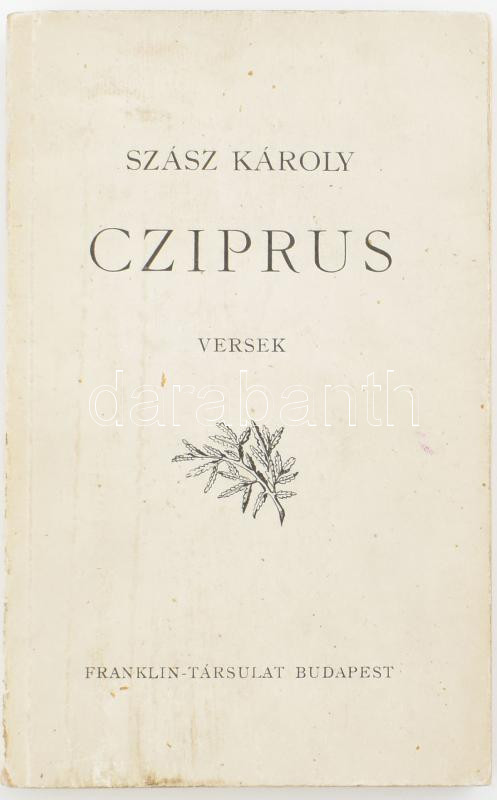 Szász Károly: Cziprus. A szerző, Szász Károly (1865-1950) író, költő, műfordító által Bosznay István (1868-1944) festőművész részére DEDIKÁLT példány. Bp., [1937.], Franklin, 1 t.+96 p. Kiadói papírkötés, foltos borítóval, javított kötéssel.