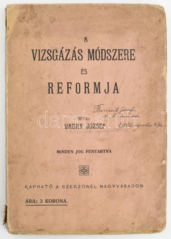 Leírás: Vaday József: A vizsgázás módszere és reformja. Nagyvárad, Szerző. Kiadói papírkötés, viseltes állapotban, ceruzás firkákkal.