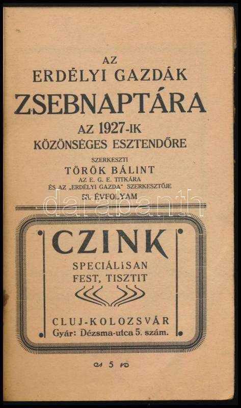 1927 Az erdélyi gazdák zsebnaptára az 1927-ik közönséges esztendőre. Szerk.: Török Bálint. 58. évfolyam. Cluj/Kolozsvár, Minerva, 152 p. Korabeli reklámokkal. Kiadói papírkötés, foltos borítóval.