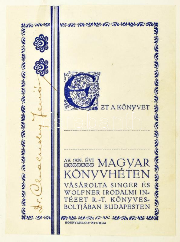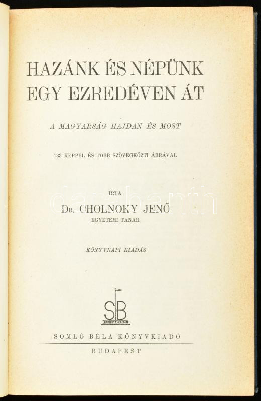 Dr. Cholnoky Jenő: Hazánk és népünk egy ezredéven át. A magyarság hajdan és most. 133 képpel és több szövegközti ábrával. Könyvnapi kiadás. Bp., Somló Béla Könyvkiadó. Kiadói egészvászon kötés, sérült gerinccel. Benne a szerző által ALÁÍRT ex librissel
