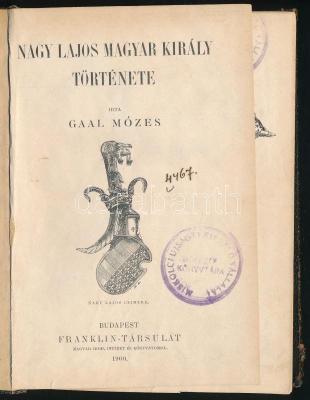 Gaal Mózes: Nagy Lajos magyar király története. Hozzákötve: Az Anjou-királyok kora Magyarországon. Művelődéstörténeti rajz. Bp., 1900., Franklin, 111+1; 95+1 p. Gazdag képanyaggal illusztrált. Átkötött kartonált papírkötés, kopott borítóval, sérült gerinccel, a borítón címkével, intézményi bélyegzőkkel, a szennylapokon reklámcímkékkel.