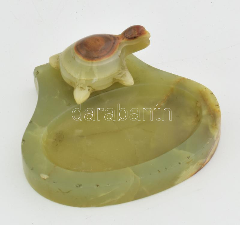 Leírás: Ónix teknős figurával díszített ékszertartó tálka, kopott, 12x11 cm