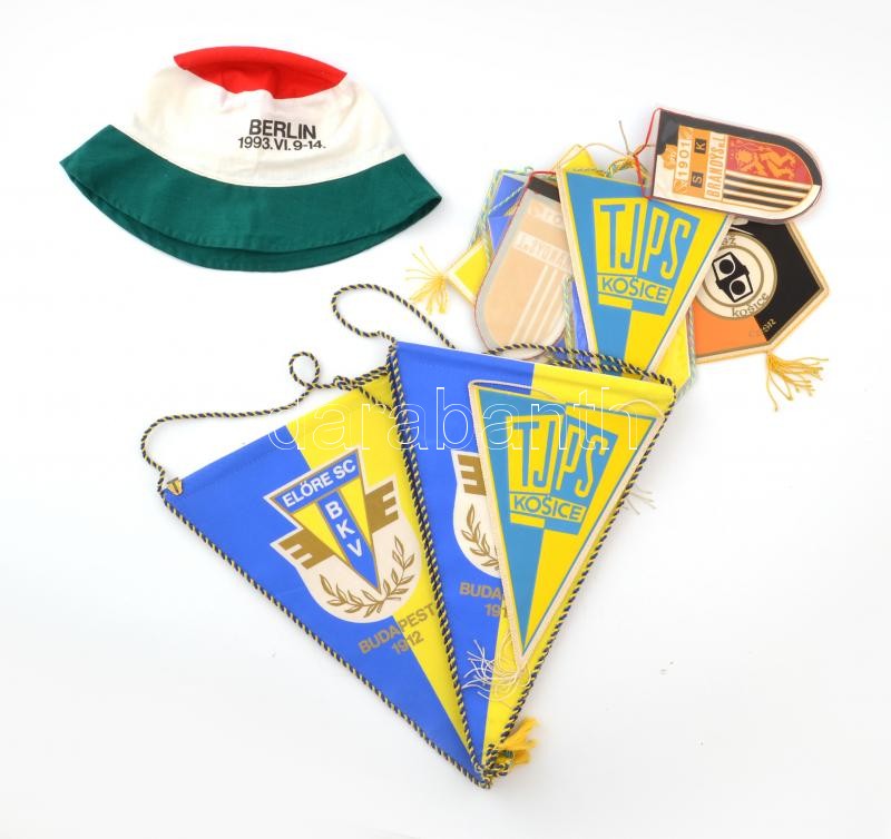 Leírás: Vegyes magyar és külföldi sportzászlók, 12 db + két kitűző + magyar trikolór szövet sapka, Berlin 1993.VI.9-14. felirattal