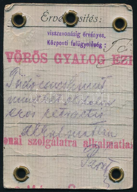 Leírás: 1919 Vörös gyalog ezred fényképes katonai igazolvány, hátoldalán "tüdőcsúcshurut (...) alkalmatlan" felirattal, kissé kopott, 8,5x6 cm
