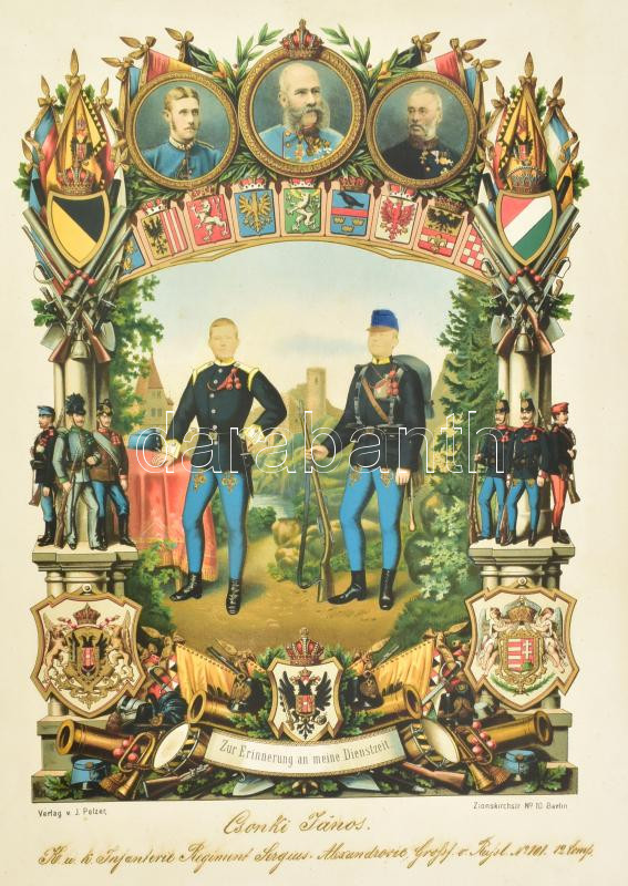 cca 1900 "Szolgálati időm emlékéül" (zur Erinnerung an meine Dienstzeit), magyar katona emléklapja, kivágott katona portré fotóval, lap alján nevesített és az gyalogezred nevével. Lap széle kissé sérült. 49×36 cm