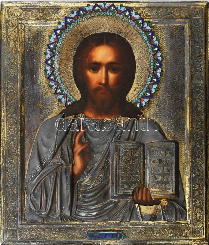 Megváltó Krisztus. Orosz ikonfestő, cca XIX. sz., tojástempera, fa, aranyozott ezüst okláddal (ezüst- és mesterjeggyel jelzett), néhol hiányos zománcozással, 31x26,5 cm