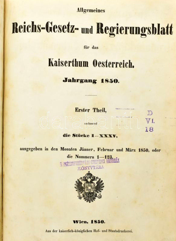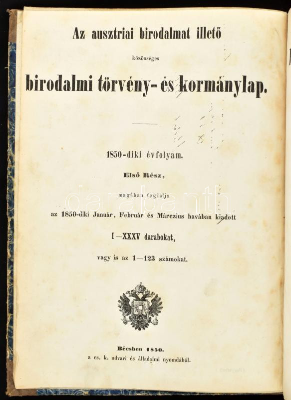 1850 Az ausztriai birodalmat illető közönséges birodalmi törvény- és kormánylap. 1850-diki évfolyam. Magyar-német bilingvis. I. kötet.Bécs, 1850., Cs. K. Udvari és Állami Nyomda. Korabeli félvászon-kötés, kopott borítóval, régi intézményi bélyegzéssel.