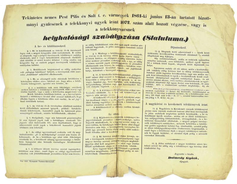 1862 Pesti, Pilis, Solt vármegyék telekkönyvezésének helyhatósági szabályozása, Dalmady Győző aljegyző által kiadott hirdetmény, szakadásokkal, 42×53 cm