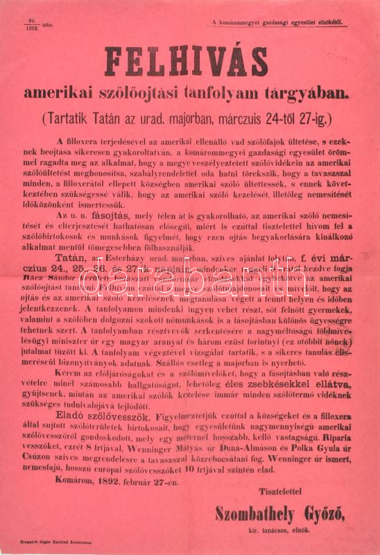Leírás: 1892 Komárom, Felhívás amerikai szőlőoltási tanfolyam tárgyában, mely a tatai uradalmi majorban lesz megtartva, 45×31 cm