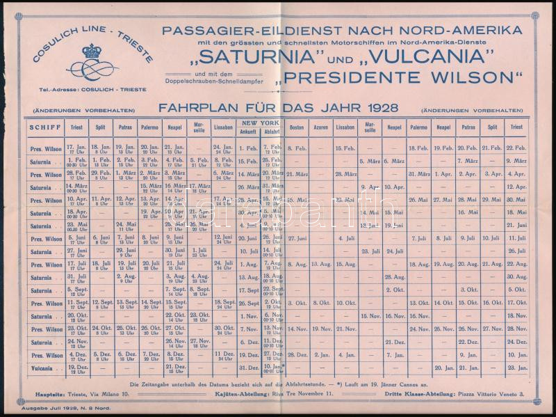 Leírás: 1928 Trieszt, Cosulich-Line, a Saturnia, a Vulcania és a Presidente Wilson hajók menetrendje