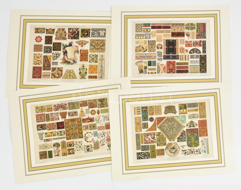 cca 1900 4 db ornamentika témájú színes illusztráció a Meyer's Lexikon 5. kiadásából, nyomat, papír, egyiken kisebb szakadással, modern paszpartuban, 21x27 cm
