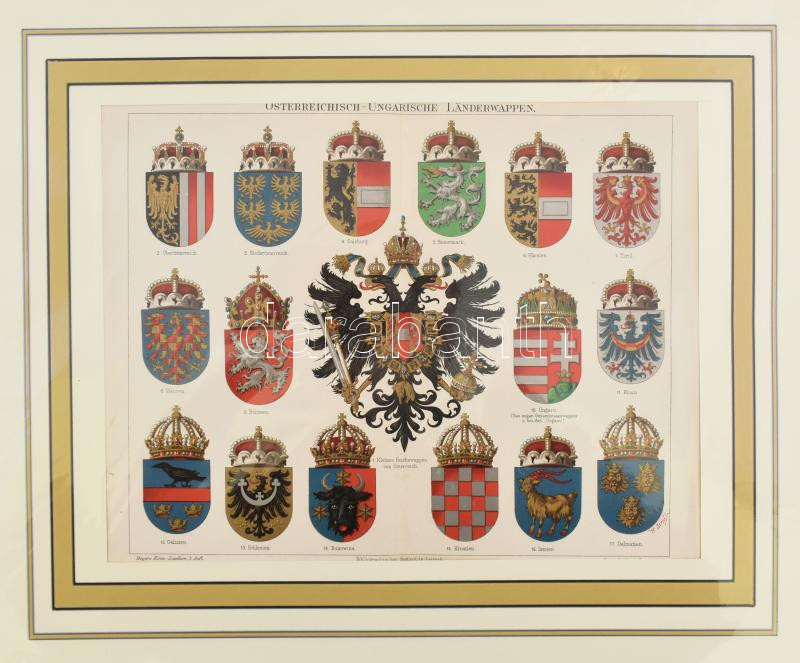 cca 1900 Ausztria-Magyarország országainak, régióinak címerei, színes illusztráció a Meyer's Lexikon 5. kiadásából, nyomat, papír, modern paszpartuban, 21x25 cm