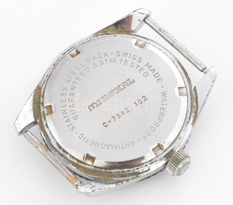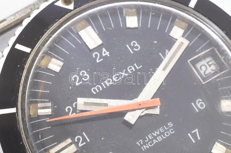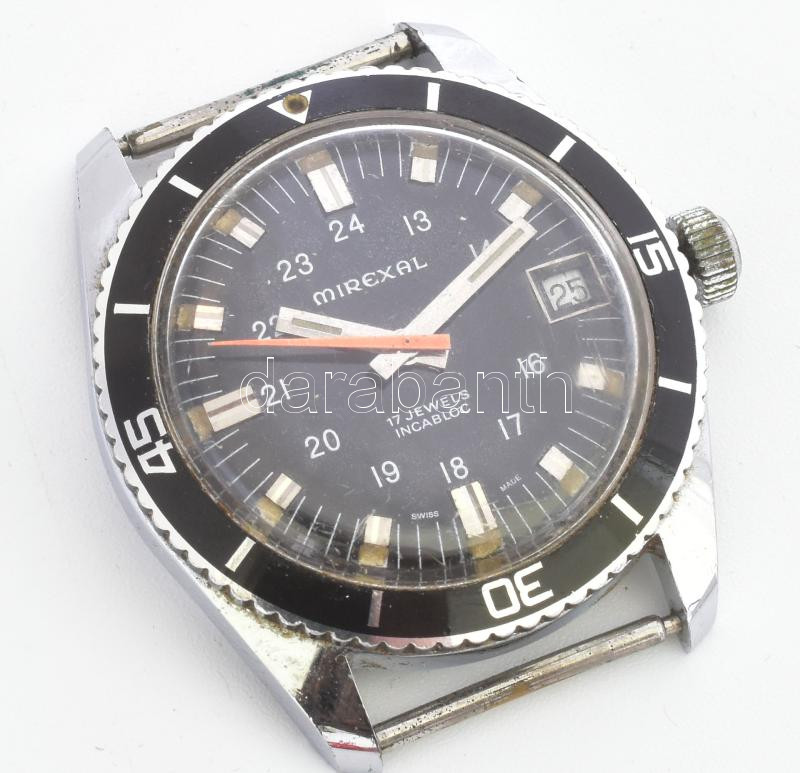 Leírás: Mirexal 17 köves kézi felhúzós búváróra forgatható lünettával, jelzett acél tokkal Működik d: 36 mm