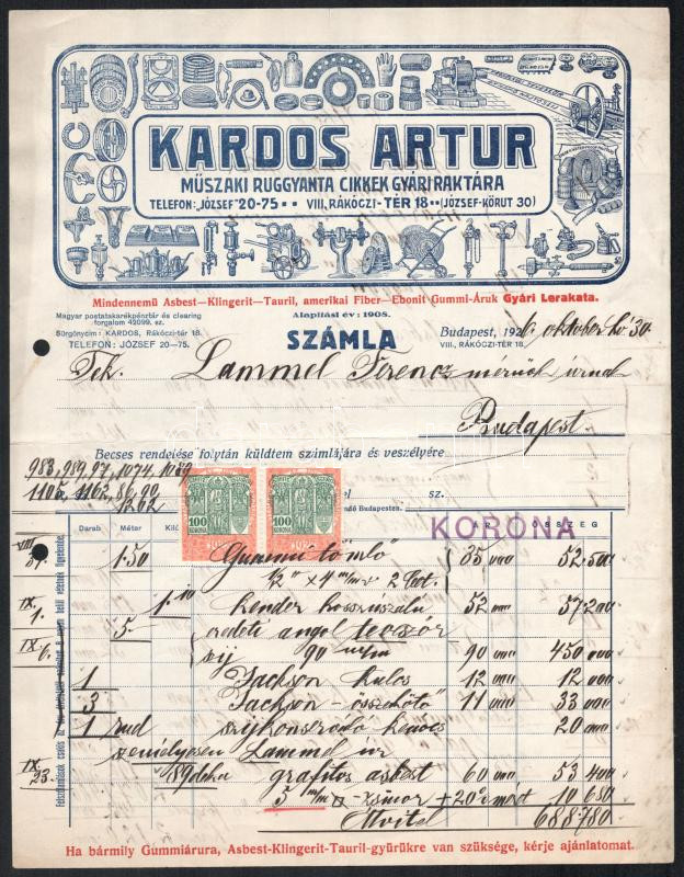 Leírás: 1926 Bp., Kardos Artur műszaki ruggyanta cikkek gyári raktára, díszes fejléces számla, 2x100 korona okmánybélyeggel, bal oldalán lyukasztással