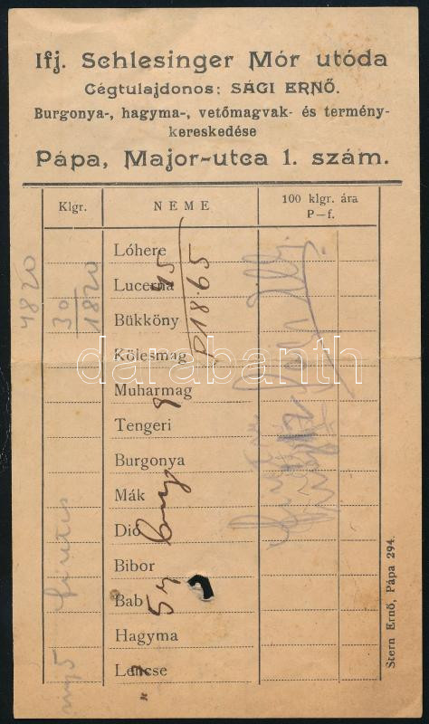1930 Pápa, ifj. Schlesinger Mór utóda Terménykereskedő Jegyzék, hátold... https://www.darabanth.com/hu/455-Gyorsarveres/455.0/Mutargy-papirregiseg-egyeb/Reklam~2000036/1930-Papa-ifj-Schlesinger-Mor-utoda-Termenykereskedo-Jegyzek-hatoldalan-kezzel-irt-szamla-2f~II3040828