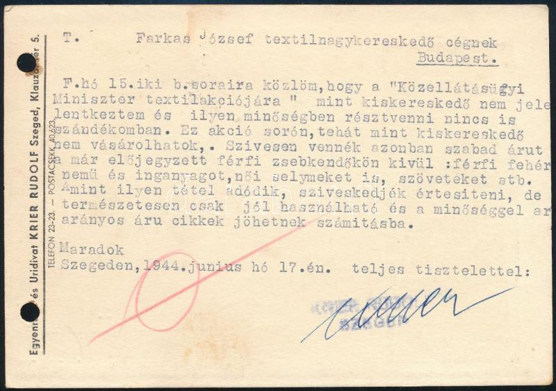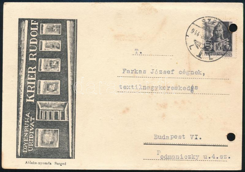Leírás: 1944 Szeged, Krier Rudolf Divatáruházának nyílt levelezőlapja az üzletportál grafikájával, jobb oldalon lyukasztással
