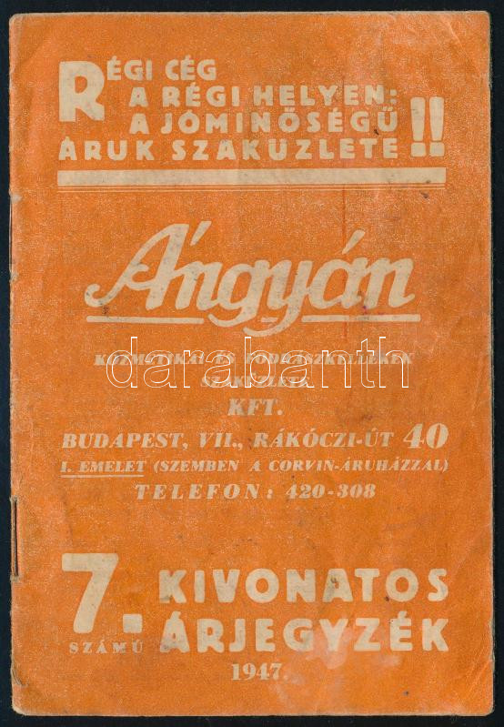 1947 Bp. VII., Ángyán Kozmetikai és Fodrászkellékek Szaküzlete 7. kivo... https://www.darabanth.com/hu/455-Gyorsarveres/455.0/Mutargy-papirregiseg-egyeb/Reklam~2000036/1947-Bp-VII-Angyan-Kozmetikai-es-Fodraszkellekek-Szakuzlete-7-kivonatos-arjegyzek-18p~II3036538