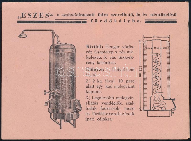 Leírás: Szántó Sándor Bp. V. Csanádi u. "Eszes" szabadalmaztatott falra szerelhető fa és széntüzelésű fürdőkályha szórólapja