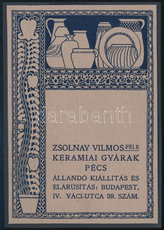 cca 1910 Kozma Lajos? által tervezett Zsolnay porcelán reklám kartonon... https://www.darabanth.com/hu/455-Gyorsarveres/455.0/Mutargy-papirregiseg-egyeb/Reklam~2000036/cca-1910-Kozma-Lajos-altal-tervezett-Zsolnay-porcelan-reklam-kartonon-12x18-cm~II3036996