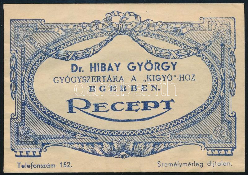 dr. Hibay György gyógyszertára a Kígyóhoz Egerben receptboríték https://www.darabanth.com/hu/455-Gyorsarveres/455.0/Mutargy-papirregiseg-egyeb/Reklam~2000036/dr-Hibay-Gyorgy-gyogyszertara-a-Kigyohoz-Egerben-receptboritek~II3031584