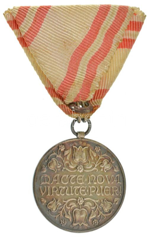 Berán Nándor (1889-1965) 1935. "A Magyar Vörös Kereszt Ifjúsági Osztálya / Macte nova virtute puer!" ezüstözött bronz kitüntetés mellszalagon, eredeti "Berán Nándor" gyártói tokban (31mm) T:AU