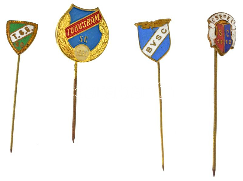 Leírás: 1959. "TSE 50 (Testvériség)" zománcozott bronz jelvény + DN "Budapesti Vasutas SC (BVSC)" zománcozott bronz jelvény + 1980-1999. "Tungsram SC" festett fém jelvény + DN "Csepel SC" zománcozott bronz jelvény T:AU,XF