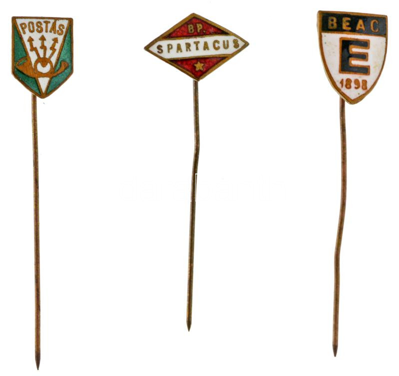 ~1950. "Budapesti Spartacus" zománcozott bronz jelvény + DN "Budapesti Egyetemi AC (BEAC)" zománcozott bronz jelvény + DN "Postás SE" zománcozott bronz jelvény T:AU