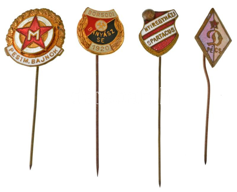 Leírás: ~1950. "Pécsi Dózsa" zománcozott bronz jelvény + DN "Nyíregyházi Spartacus" zománcozott bronz jelvény + DN "Borsodi Bányász" zománcozott bronz jelvény + DN "Pest megyei bajnok" zománcozott bronz jelvény T:AU,XF