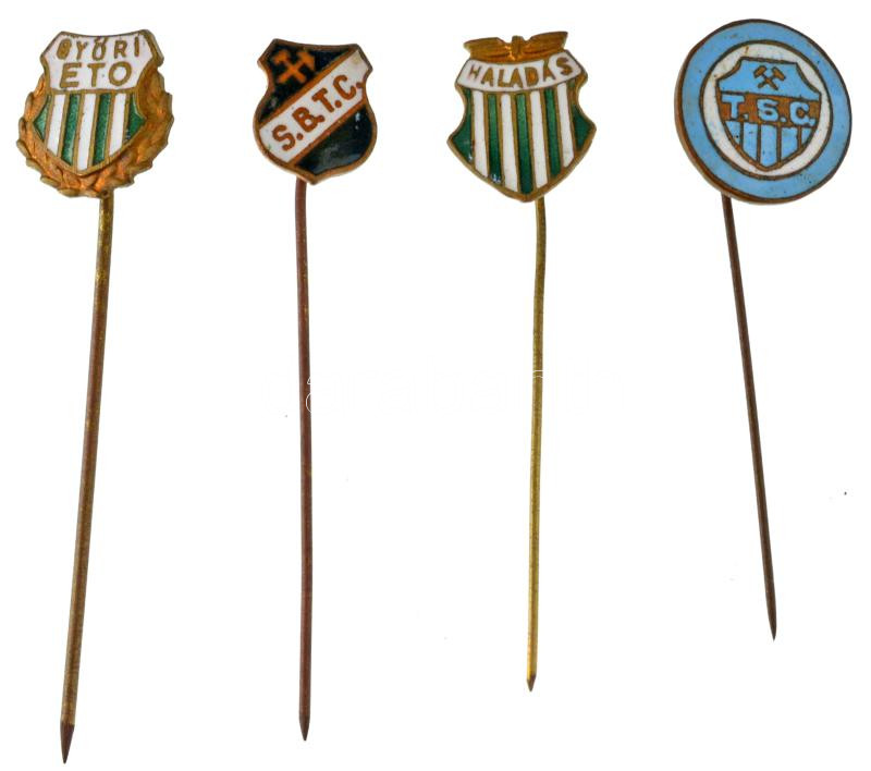 Leírás: ~1950. "TSC (Tatabánya SC)" zománcozott bronz jelvény + ~1960. "SBTC (Salgótarjáni Bányász TC)" zománcozott bronz jelvény + DN "Haladás" zománcozott bronz jelvény + DN "Győri ETO" zománcozott bronz jelvény T:AU,XF