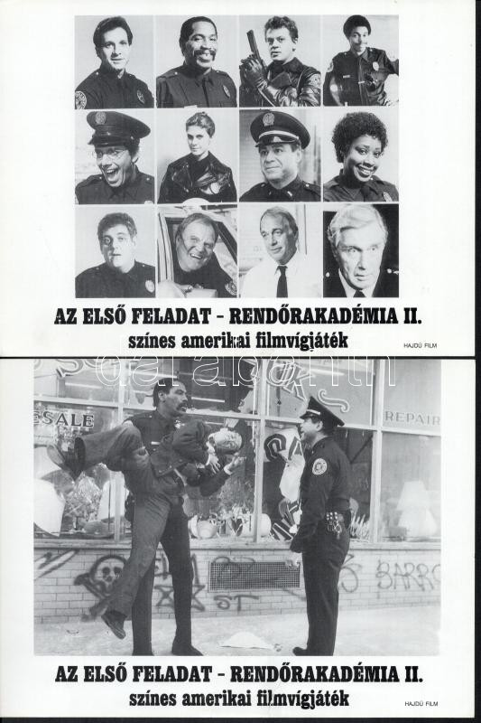 1985 ,,Az első feladat - Rendőrakadémia II." című amerikai filmvígjáték jelenetei és szereplői, 9 db produkciós filmfotó (vitrinfotó, lobbyfotó) nyomdatechnikával sokszorosítva, egyoldalas nyomással, a használatból eredő (esetleges) kisebb hibákkal, 18x24 cm
