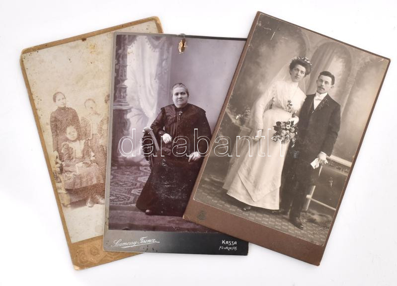 cca 1900-1910 3 db kabinetfotó (esküvői fotó, portré, családi kép), különböző műtermekből (Atelier Sport és Szamossy Ferenc Kassa, Franz Spatzier Trautenau), változó állapotban, 16,5x10,5 cm