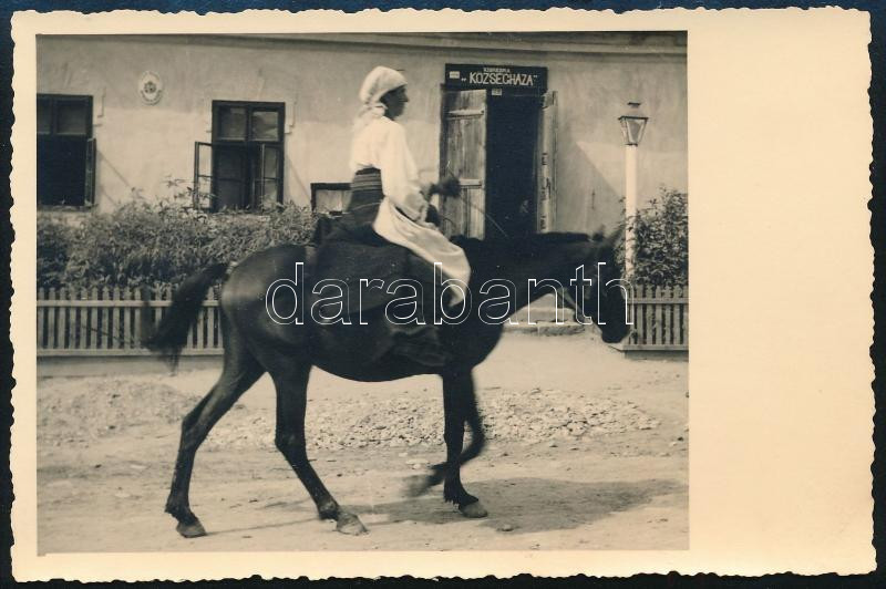 cca 1940 Kisrebra (Rebrisoara, Beszterce-Naszód megye, Erdély) - Községháza (az épület ajtaja fölött jól olvasható a felirat), az előtérben lovon ülő asszony, fotó, 8,5×13 cm