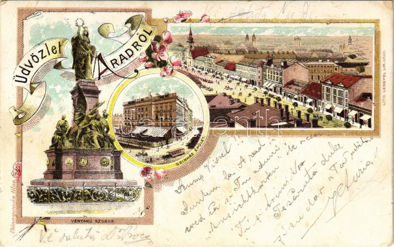 Leírás: 1898 (Vorläufer) Arad, Vértanú szobor, színház, Fő tér. Lengyel Lipót kiadása / martyrs statue, theatre. Art Nouveau, floral, litho (EB)