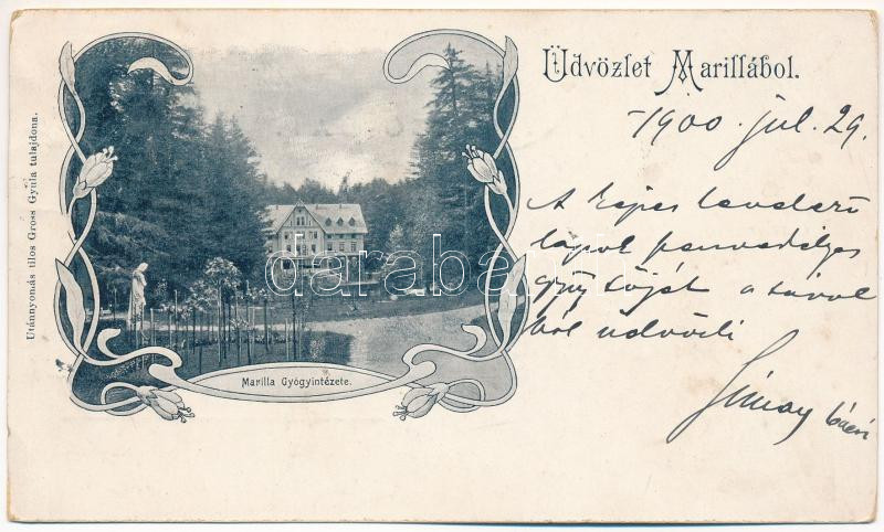 Leírás: 1900 Marilla, Marillavölgy, Marila; Gyógyintézet. Gross Gyula kiadása / spa. Art Nouveau (Rb)