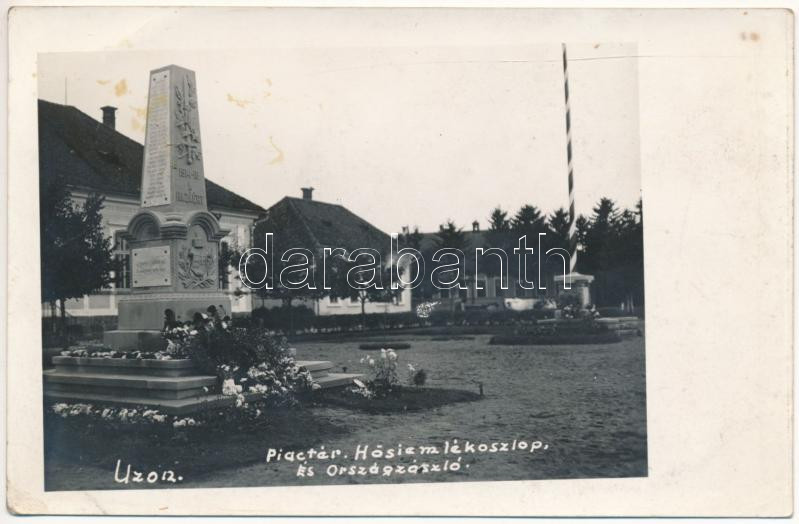 Leírás: Uzon, Usendorf, Ozun; Piactér, Hősi emlékoszlop és Országzászló / market square, heroes monument, Hungarian flag. Puskás István photo (fl)