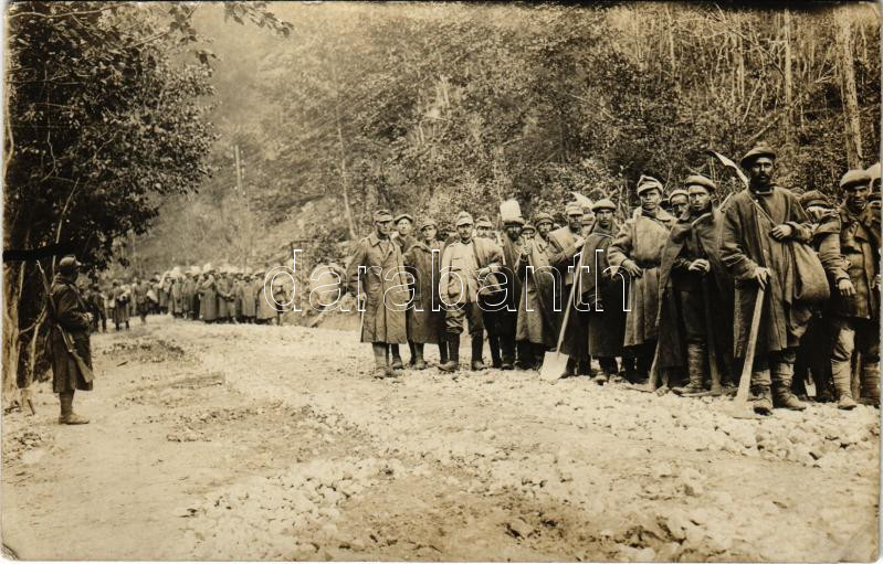 Leírás: 1917 Útépítő orosz fogoly munkásszázad az Úz völgyében / WWI Russian POWs (prisoners of war) road construction workers in Uzh river valley. photo (EK)