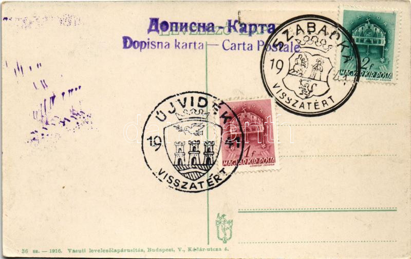 Leírás: Szabadka, Subotica; Törvényszék. Vasúti levelezőlapárusítás 36. sz. 1916. / court + "1941 Szabadka visszatért" "1941 Újvidék visszatért" So. Stpl. (EK)