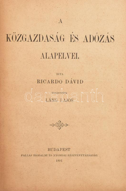 Ricardo Dávid: A közgazdaság és adózás alapelvei. Ford.: Láng Lajos. B... https://www.darabanth.com/hu/456-Gyorsarveres/456.0/Konyvek/Konyvek-Jog~1000016/Ricardo-David-A-kozgazdasag-es-adozas-alapelvei-Ford-Lang-Lajos-Bp-1891-Pallas-Korabeli~II3048238