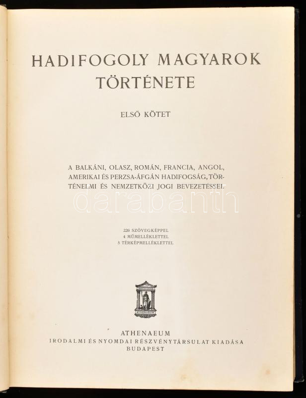 Hadifogoly magyarok története. 1. köt. Szerk.: Baja Benedek - Pilch Jenő - Lukinich Imre - Zilahy Lajos. Bp., [1930], Athenaeum. Gazdag képanyaggal illusztrált. Kiadói egészvászon-kötésben, kissé kopott, foltos borítóval.